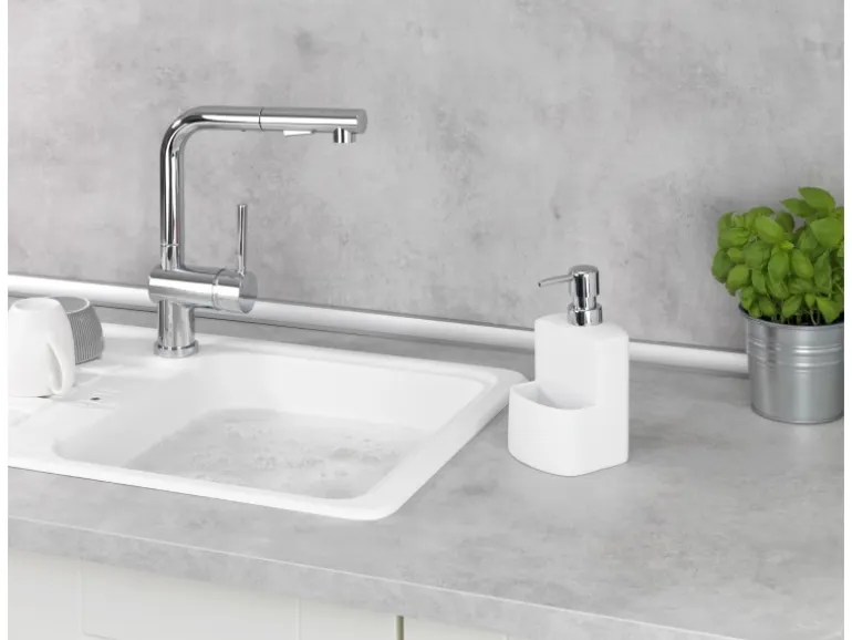 Der dekorative Seifenspender kann individuell mit bis zu ca. 380 ml Spülmittel gefüllt werden. Durch leichten Druck auf den Dosierknopf wird die gewünschte Menge Spülmittel herausgepumpt.