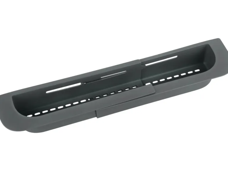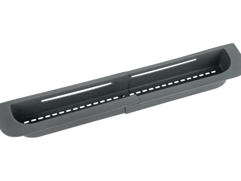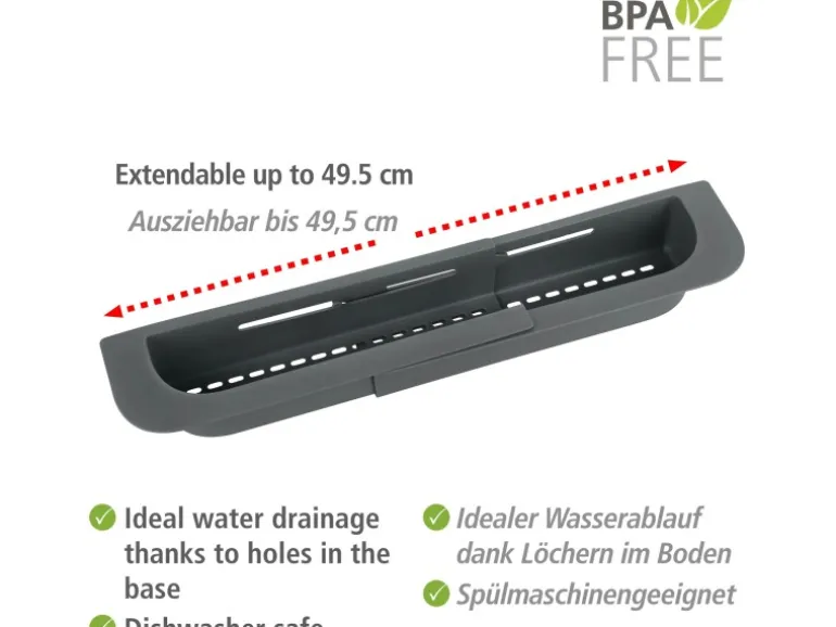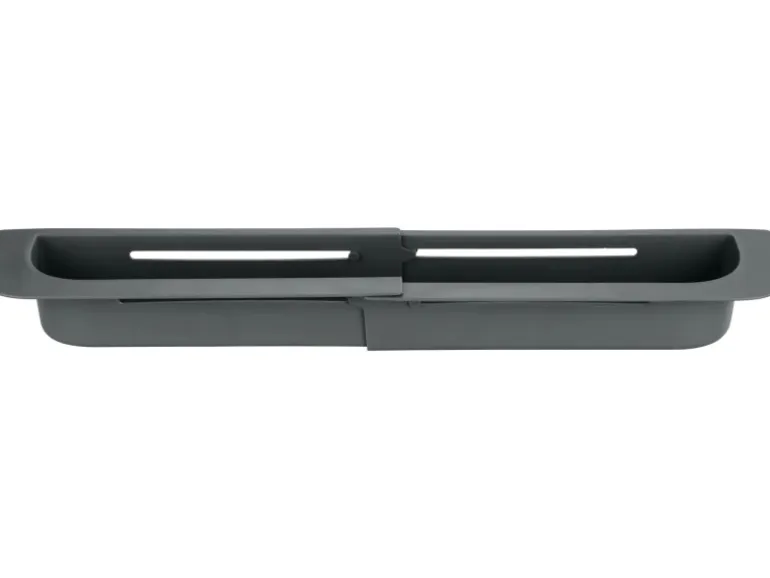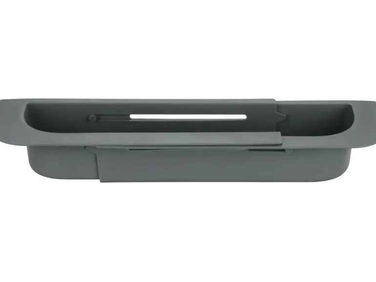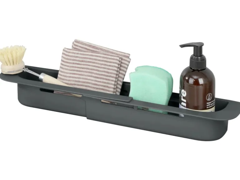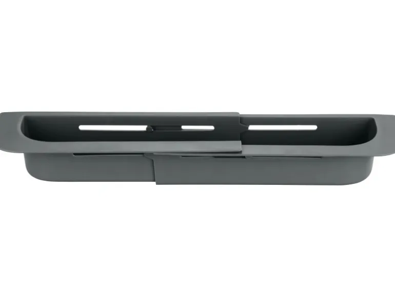 Durch seinen breiten Rand kann der Organizer in das Becken eingehängt werden. Auf bis zu 49,5 cm lässt sich der Spülhelfer flexibel ausziehen und passt sich dem Spülbecken so individuell an. Zusammengeschoben misst der schmale Organizer (B x H x T): 36 x 5,5 x 8,5 cm.