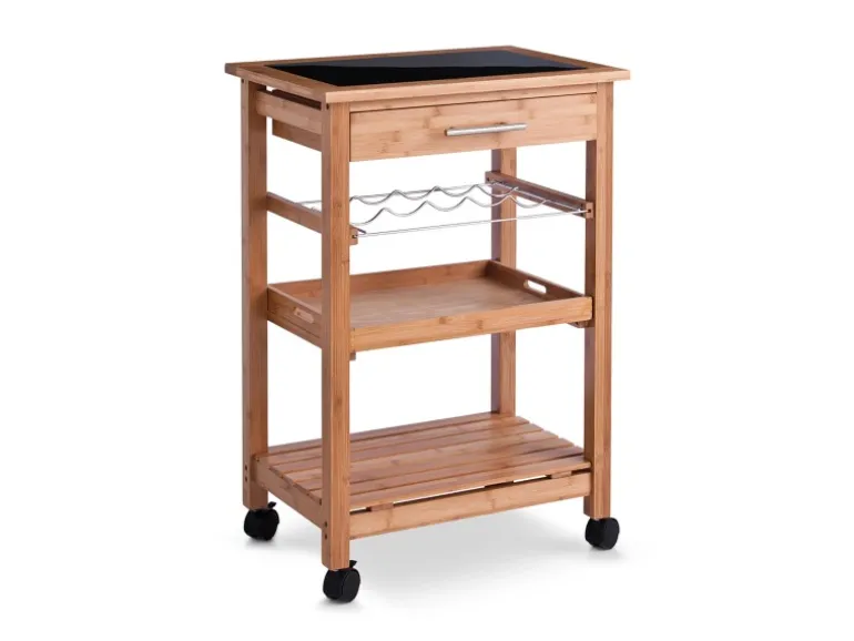 Hier finden einige Ihrer Küchenutensilien ihren Platz. Die 4 komplett beweglichen Doppellaufrollen sorgen dafür, dass der Wagen nie im Weg steht und die 2 integrierten Feststellbremsen halten ihn bei Bedarf fest an seinem Platz. Die Montage des Küchenrollwagens geht schnell und ist unkompliziert.