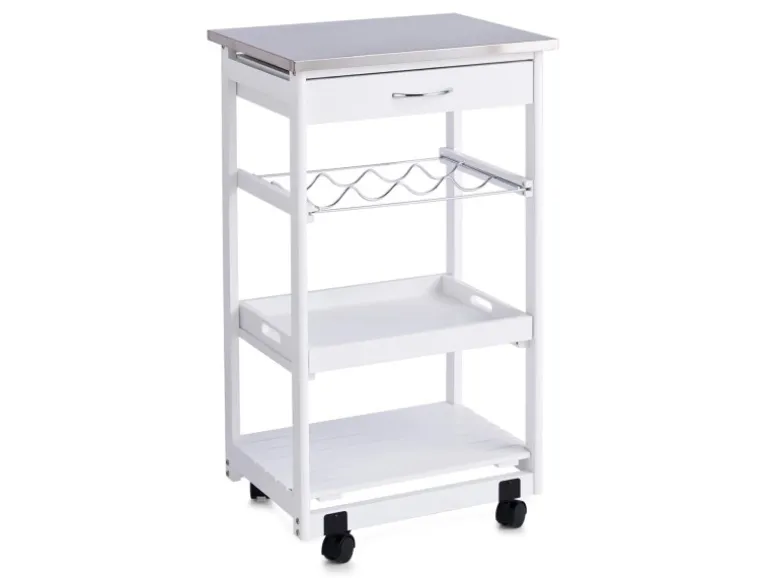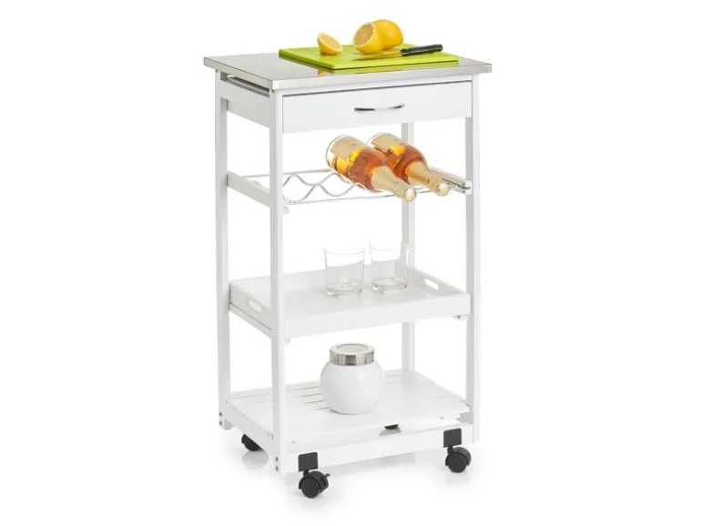 Hier finden einige Ihrer Küchenutensilien ihren Platz. Die 4 komplett beweglichen Doppellaufrollen sorgen dafür, dass der Wagen nie im Weg steht und die 2 integrierten Feststellbremsen halten ihn bei Bedarf fest an seinem Platz. Die Montage des Küchenrollwagens geht schnell und ist unkompliziert.