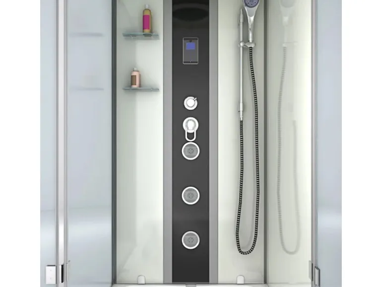 Alle Anschlüsse (Wasser, Abfluss) sind flexibel. Alle Schläuche werden zudem in verstärkter Ausührung geliefert. Die Wasserschläuche zur Dusche sind bis zu einem maximalen Druck von 4 Bar ausgelegt. Die Wasserschläuche zu den einzelnen Brausen sind in doppelwandiger Ausführung mit Textileinlage und ebenfalls weit über den normalen Wasserdruck hinaus belastbar. – Wasseranschlüsse für Kalt/Warmwasser: 1/2″ 2-4 bar Wasserdruck