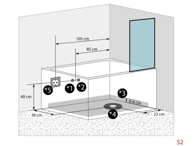 – Anschluss-Maße (Skizze S2): *1 Warm- und *2 Kaltwasser, auch gegenüberliegend möglich, *3 Bereich für Abflussrohre, *4 freier Bereich um den Abfluss-Siphon, *5 Stromanschluss nur Variante mit Whirlpool/AIR