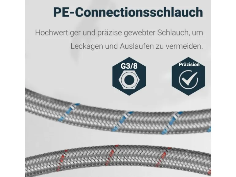 Anschluss: Flexible Schläuche G3/8″ (Länge: 600 mm), Keramikkartusche (35 mm) als Ventil.