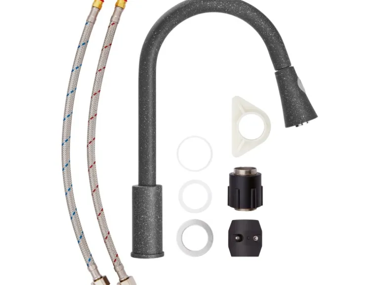 Den angenehm weichen Wasserstrahl kannst du der enthaltenen Mischdüse verdanken. Darüber hinaus haben wir bereits eine hochwertige Kartusche mit keramischen Dichtscheiben verbaut – damit kannst du die Armatur nach dem Einbau sofort nutzen. Und weil du eine Küche willst, die lange hält, besteht die Armatur aus solidem Messing. Mit ihrer Granitoptik in Schwarz sieht die Küchenarmatur besonders modern aus. Und damit du bei der Montage nicht unnötig Zeit verschwenden musst, legen wir der Armatur alles an Material bei, das du dafür brauchst.