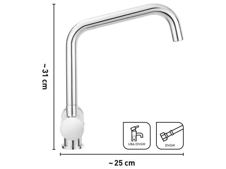 Klares Design und Funktionalität verbindet die baliv Küchenarmatur KI-1370 Chrom. Da die Armatur kipp- und schwenkbar ist, eignet sie sich besonders zur Montage unterhalb eines nach innen geöffneten Fensters. Die Armatur verfügt über eine geprüfte Markenkartusche, eine Neoperl Mischdüse und Anschlussschläuche, die der aktuellen Trinkwasserverordnung entsprechen. Durch die Bedienbarkeit mit einer Hand kann bequem die Durchflussmenge und die Temperatur geregelt werden.