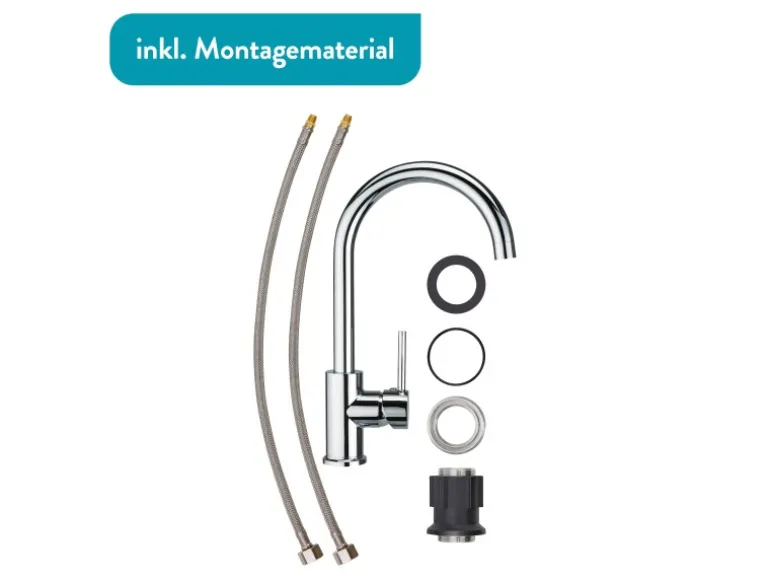 Einen weichen Wasserstrahl bietet dir die enthaltene Mischdüse. Und da wir dir eine hochwertige Kartusche mit keramischen Dichtscheiben bereits verbaut haben, kannst du nach dem Einbau sofort loslegen. Und weil du eine Küche willst, die lange hält, besteht die Armatur aus solidem Messing. Für ein schickes Aussehen besitzt die Armatur eine verchromte Oberfläche. Und damit du bei der Montage nicht unnötig Zeit verschwenden musst, legen wir der Armatur alles an Material bei, das du dafür brauchst.