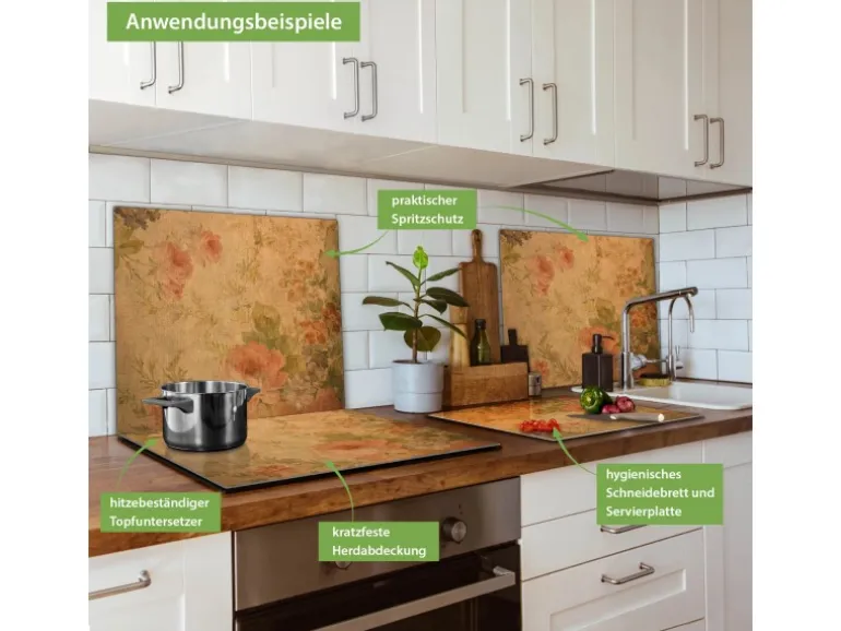 Banjado Herdabdeckplatte Glas 1 Teilig 60x52CM Schneidebrett Herdabdeckung Mit Motiv Blumen Antik