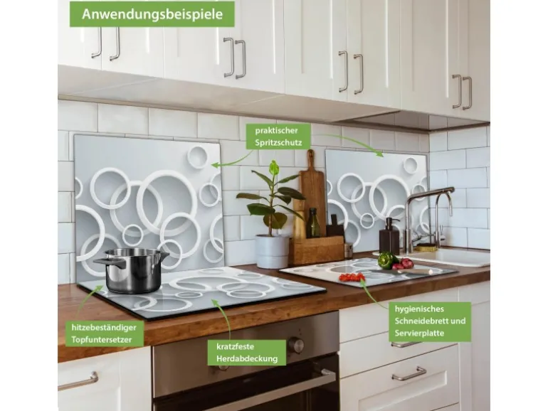 Banjado Herdabdeckplatte Glas 1 Teilig 60x52CM Schneidebrett Herdabdeckung Mit Motiv Weiße Ringe