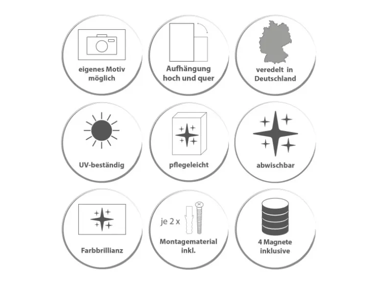 Die Magnet Pinnwand besteht aus silber lackiertem Stahl in der Größe 78 x 37cm. Die aufgebrachte Motivfolie ist mit einem Schutzlaminat überzogen, wodurch sie UV-Resistent und stoßfest ist.