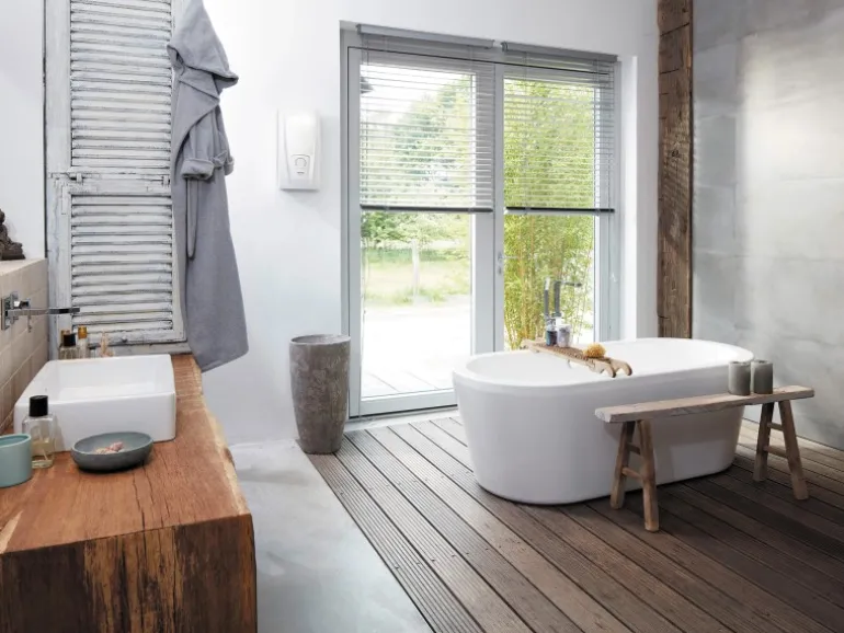 Ein Zumischen von Kaltwasser ist nicht nötig. Der Durchlauferhitzer erwärmt das Wasser sekundenschnell auf Ihre Wunschtemperatur und punktet zudem durch kurze Leitungswege.