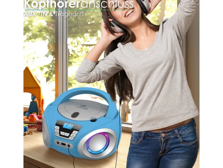 CD-/MP3-Player für Audio-CDs, CD-R und CD-RW mit Repeat-/All-FunktionUSB-Eingang zur Musikwiedergabe von DatenträgernDigitales FM-Radio mit 20 SenderspeichernLED-Disco-BeleuchtungAUX-IN-Anschluss für externe GeräteKopfhöreranschlussGroßes LCD-Display mit blauer HintergrundbeleuchtungTeleskopantenne für optimalen EmpfangTragegriff für einfachen TransportKlarer Stereo-Sound (2x 2W RMS)Netzbetrieb: 220–240V ~ 50HzBatteriebetrieb: DC 12V, 4x „C“-Batterien (nicht enthalten)