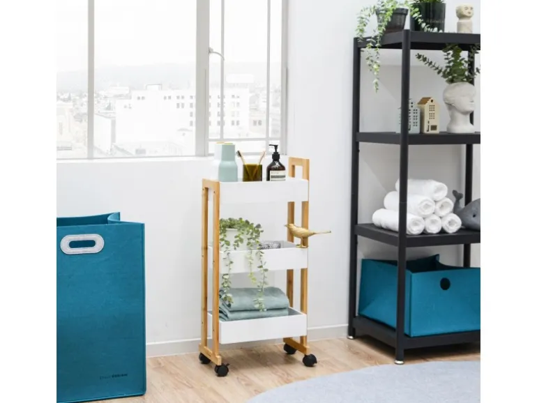 Geräumige Holzkörbe mit hohem Rand, damit nichts herunterfallen kann, wenn Du den Rollwagen bewegst.