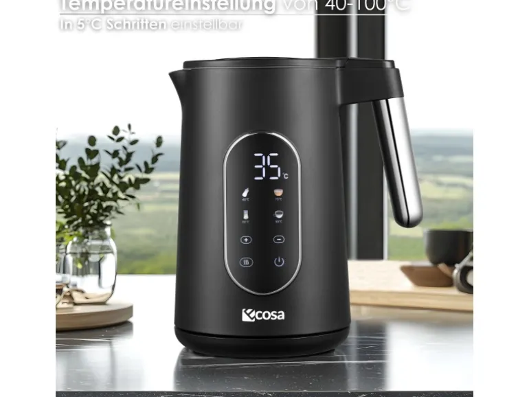Der Wasserkocher bietet fünf Temperatureinstellungen, die auf dem großen Digitaldisplay angezeigt werden. So können Sie die Temperatur präzise für verschiedene Getränke einstellen: