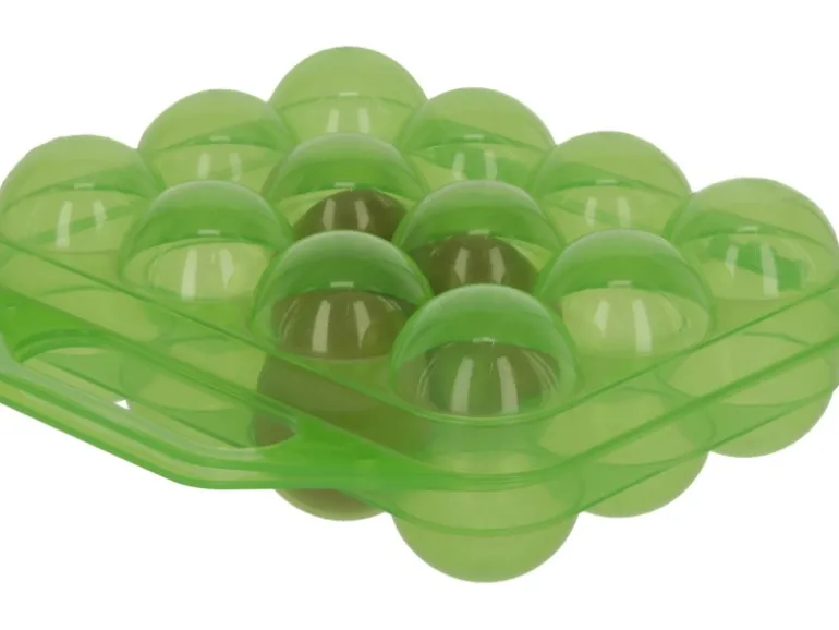 Die Eier-Transportbox ist grüntransparent. Sie ist rechteckig und besteht aus Kunststoff.