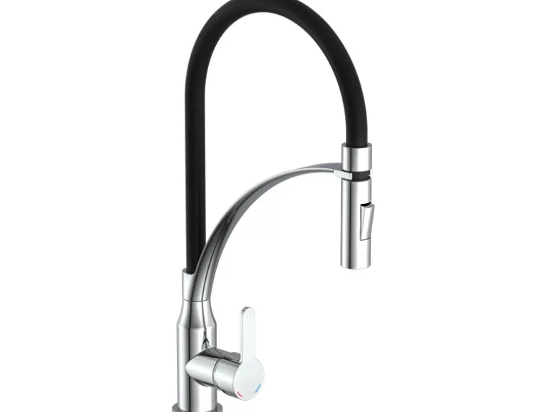 Elegante Standarmatur in Chrom mit hohem Bogenauslauf und farbigem Soft-Touch-Auslauf
