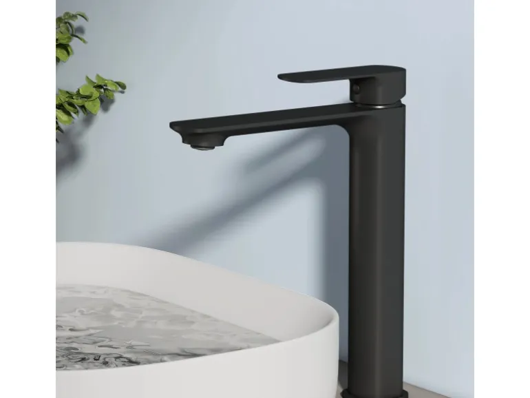 Elegantes Design: Armatur mit ergonomischem, geneigtem Griff für komfortable Handhabung.
