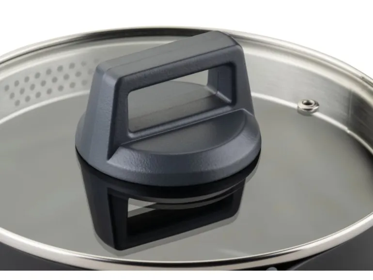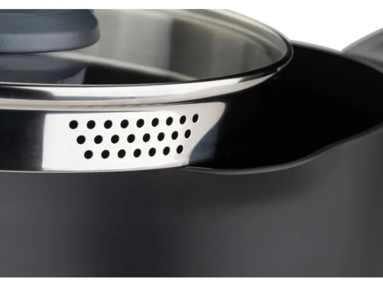 Inklusive Deckel aus gehörtetem Glas mit Entlüftungsventil und Ausgießfunktion