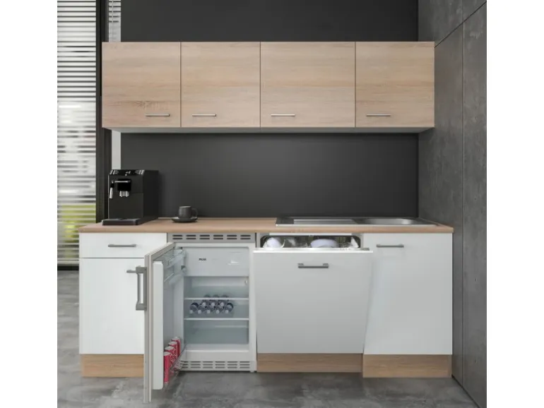 Die Fronten in zeitlosem Weiß und Sonoma Eiche sorgen für ein warmes, einladendes Ambiente. Edelstahlfarbene Bügelgriffe runden das Gesamtbild harmonisch ab. Die hochwertigen Kunststofffronten bestechen nicht nur durch ihre Optik, sondern sind auch pflegeleicht.