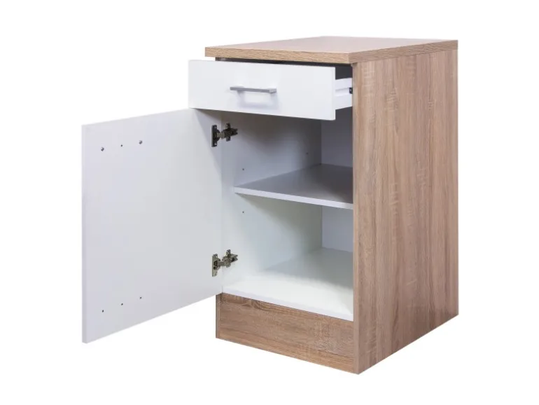 1 Unterschrank (50 x 82,2 x 57 cm) mit 1 Schubkasten – 1 Drehtür – 1 Einlegeboden