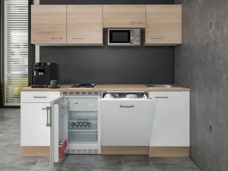 Der Unterschrank mit Schubkasten und Drehtür bietet zusammen mit den Hängeschränken viel Stauraum für Geschirr, Besteck und Vorräte. Auch im 50 cm breiten Spülenunterschrank finden noch so manche Putzutensilien ihren Platz. Die Türen der Schränke sind sowohl für den links- als auch rechtsseitigen Aufbau vorbereitet, was Ihnen ein Höchstmaß an Flexibilität bei der Montage bietet. Moderne Elektrogeräte, wie zum Beispiel ein vollintegrierter Geschirrspüler, eine Mikrowelle, ein kleines Kochfeld sowie ein Unterbau-Kühlschrank mit 3-Sternen Gefrierfach runden diese durchdachte Küchenzeile ab.