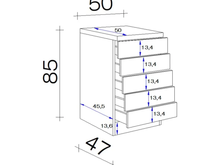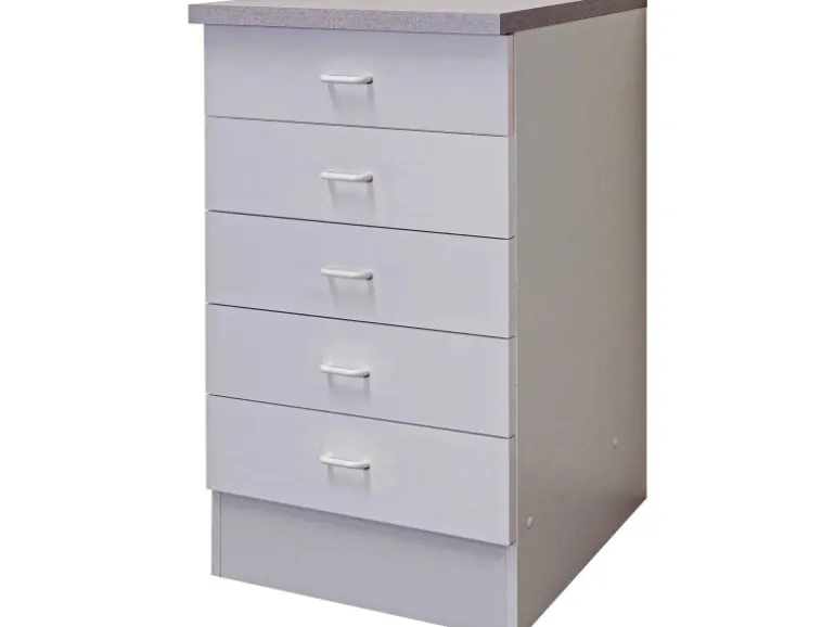 Der 50 cm breite Schubkastenschrank weiß durch eine hochwertige Verarbeitung sowie Materialauswahl zu gefallen und garantiert Ihnen auch auf kleinen Flächen eine Vielzahl von Stauraummöglichkeiten. In insgesamt fünf Schubkästen finden Ihre Küchenutensilien ihren passend Platz.