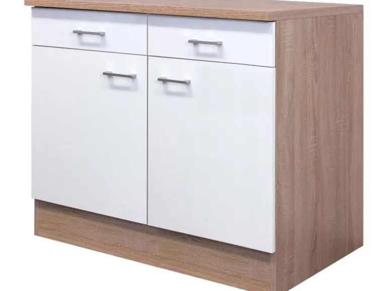 Der 100 cm breite Unterschrank überzeugt durch seine melaminbeschichteten Oberflächen, durch die er besonders pflegeleicht und robust ist. Auch auf kleinen Flächen bietet er ein Höchstmaß an Stauraum. Links und rechts befinden sich zwei Drehtüren, die viel Stauraum bieten und hinter denen Sie Ihre Küchenutensilien, Geschirr und Gläser blickdicht verstauen können. Durch den Einlegeboden schaffen Sie zusätzliche Ordnung. Darüber befinden sich zwei Schubkästen, in denen zum Beispiel Besteck ihren Platz finden.