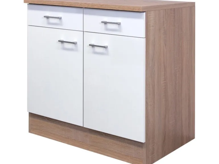 Der 80 cm breite Unterschrank überzeugt durch seine melaminbeschichteten Oberflächen, durch die er besonders pflegeleicht und robust ist. Auch auf kleinen Flächen bietet er ein Höchstmaß an Stauraum. Links und rechts befinden sich zwei Drehtüren, die viel Stauraum bieten und hinter denen Sie Ihre Küchenutensilien, Geschirr und Gläser blickdicht verstauen können. Durch den Einlegeboden schaffen Sie zusätzliche Ordnung. Darüber befinden sich zwei Schubkästen, in denen zum Beispiel Besteck ihren Platz finden.