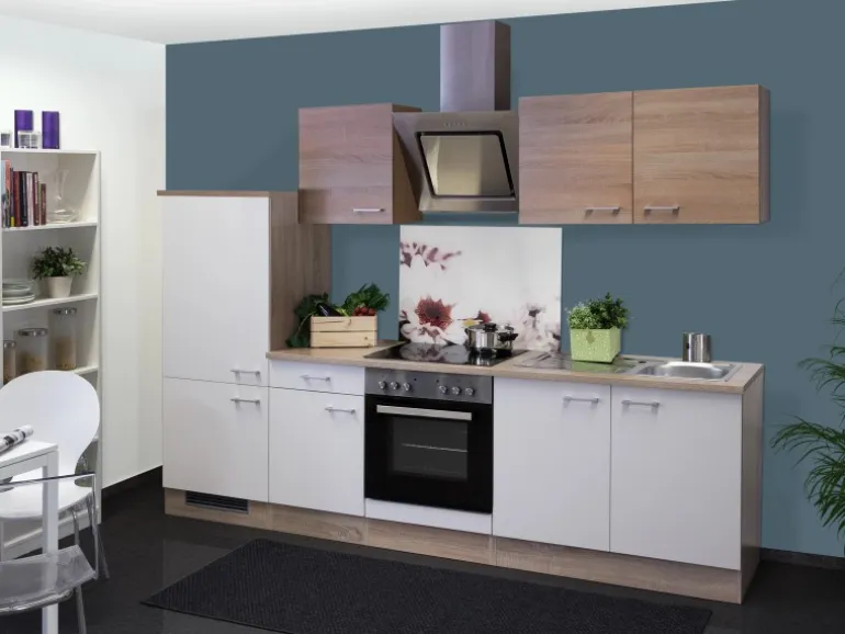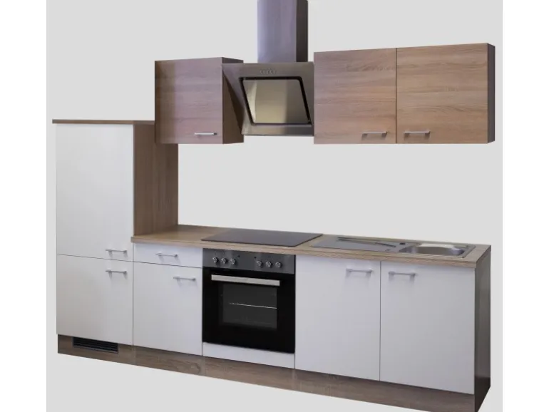 Die 270 cm breite Küchenzeile besteht aus (BxHxT):