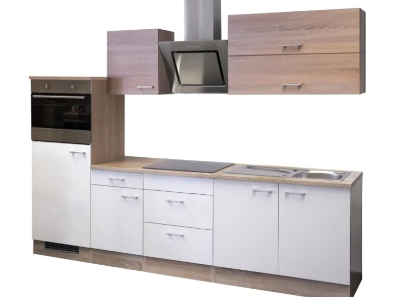 Die Küchenzeile inkl. Elektrogeräte und Einbauspüle wird Ihnen zerlegt und ohne Dekoration geliefert und eignet sich zur flexiblen Selbstmontage. Somit sind die Anordnung der Küchenelemente und die Anschläge der Türen für Sie frei wählbar. Die Arbeitsplatte wird ohne Ausschnitte geliefert. Im Lieferumfang der Spüle sind kein Siphon und keine Armatur enthalten.