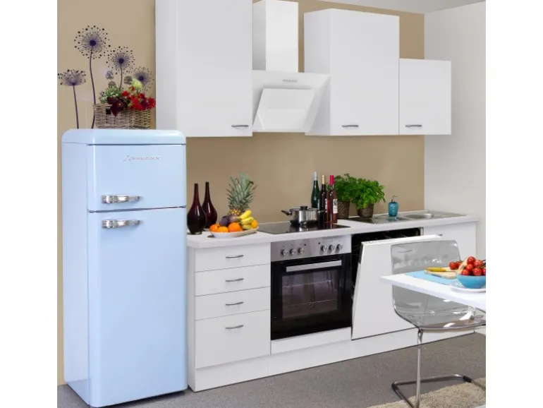 Zwei 89 cm hohe Hängeschränke und ein 55 cm hoher Hängeschrank mit bis zu zwei Einlegeböden bieten reichlich Platz für Geschirr und Gläser. Im Unterschrank mit drei Schubkästen und einem Auszug finden Besteck, Töpfe und/oder Vorräte ihren Platz. Auch im Spülenunterschrank mit eingebauter Edelstahlspüle steht genügend Fläche zur Verfügung, um noch mancherlei Küchen- und Putzutensilien zu verstauen. Bei Bedarf können Sie Ihre Küche einfach mit weiteren Schränken aus der Serie erweitern.
