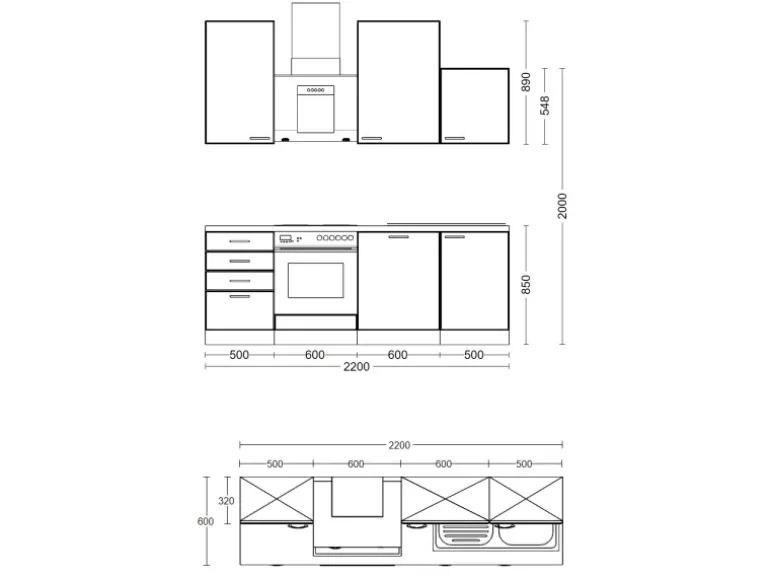 Die 220 cm breite Küchenzeile besteht aus (BxHxT):