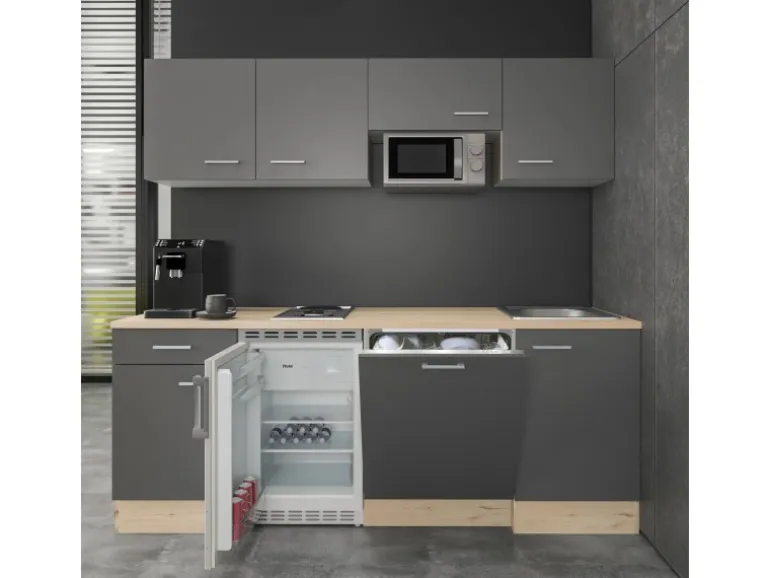 Der Unterschrank mit Schubkasten und Drehtür bietet zusammen mit den Hängeschränken viel Stauraum für Geschirr, Besteck und Vorräte. Auch im 50 cm breiten Spülenunterschrank finden noch so manche Putzutensilien ihren Platz. Die Türen der Schränke sind sowohl für den links- als auch rechtsseitigen Aufbau vorbereitet, was Ihnen ein Höchstmaß an Flexibilität bei der Montage bietet. Moderne Elektrogeräte, wie zum Beispiel ein vollintegrierter Geschirrspüler, eine Mikrowelle, ein kleines Kochfeld sowie ein Unterbau-Kühlschrank mit 3-Sternen Gefrierfach runden diese durchdachte Küchenzeile ab.