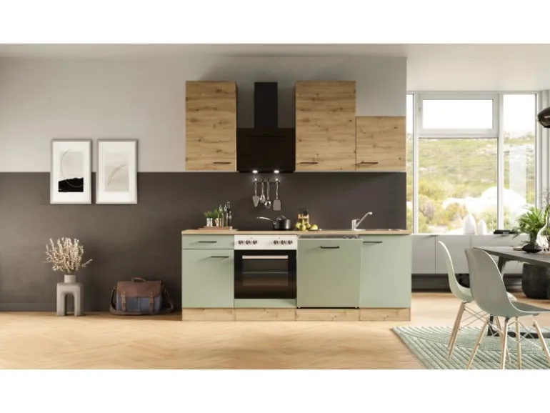 Flex-Well Küchenzeile mit pflegeleichter Anti-Fingerprint-Oberfläche in Schilfgrün (matt) und edler Holzoptik