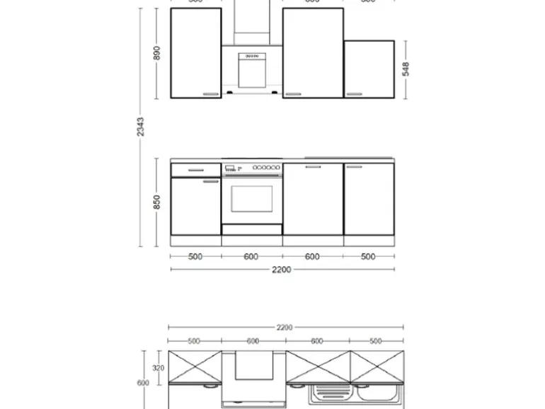 Die 220 cm breite Küchenzeile (B x H x T) besteht aus: