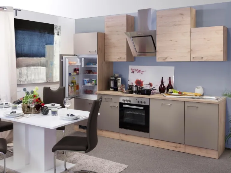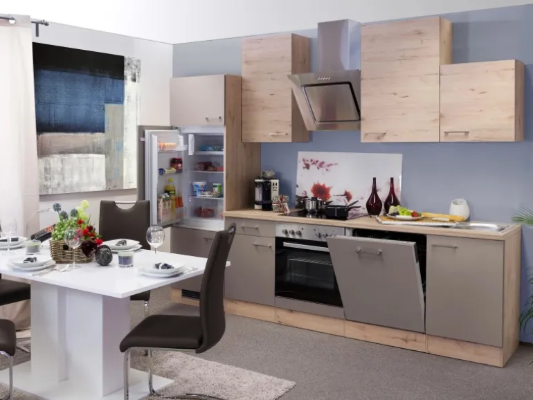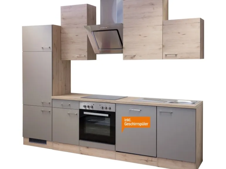 Die 280 cm breite Küchenzeile besteht aus (HxBxT):