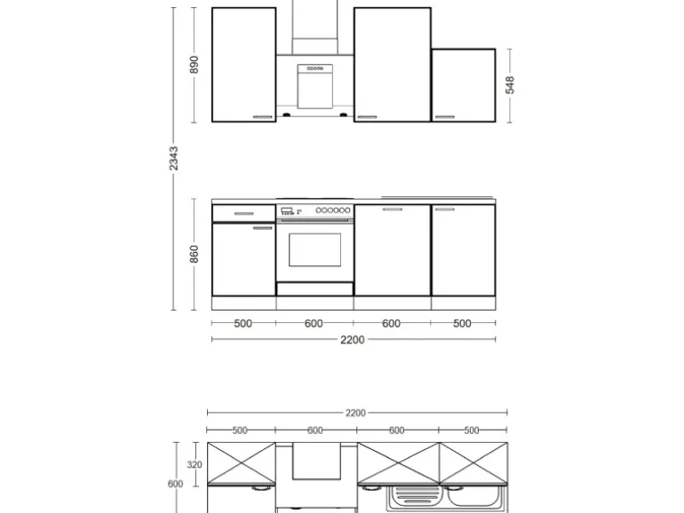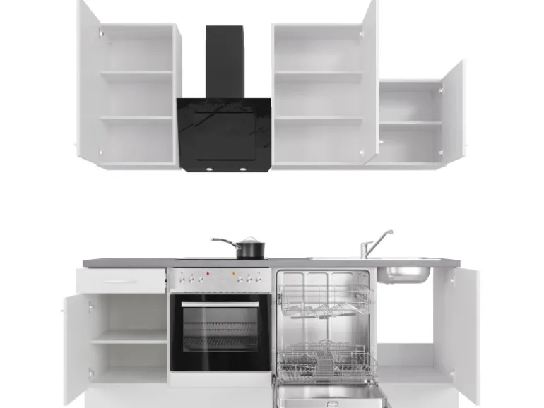 Die 220 cm breite Küchenzeile (B x H x T) besteht aus: