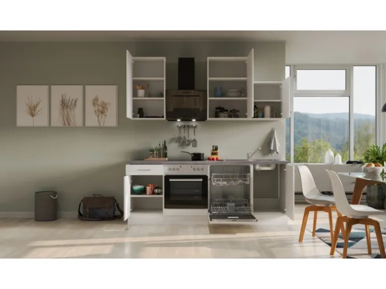 Ein 55 cm und zwei 89 cm hohe Hängeschränke mit bis zu zwei Einlegeböden bieten reichlich Platz für Geschirr und Gläser. Im Unterschrank mit Schublade und einem Einlegeboden finden Besteck, Töpfe und/oder Vorräte ihren Platz. Auch im geräumigen Spülenunterschrank lässt sich noch manches Küchen- und Putzutensil problemlos unterbringen. Und wenn es wirklich einmal mehr werden sollte, können Sie Ihre Küche einfach mit weiteren Schränken aus der Serie erweitern.