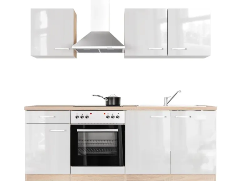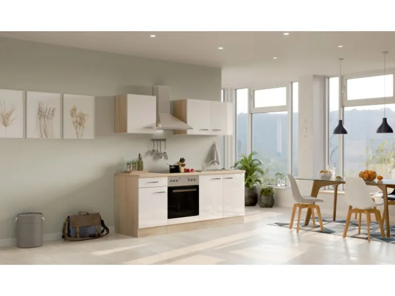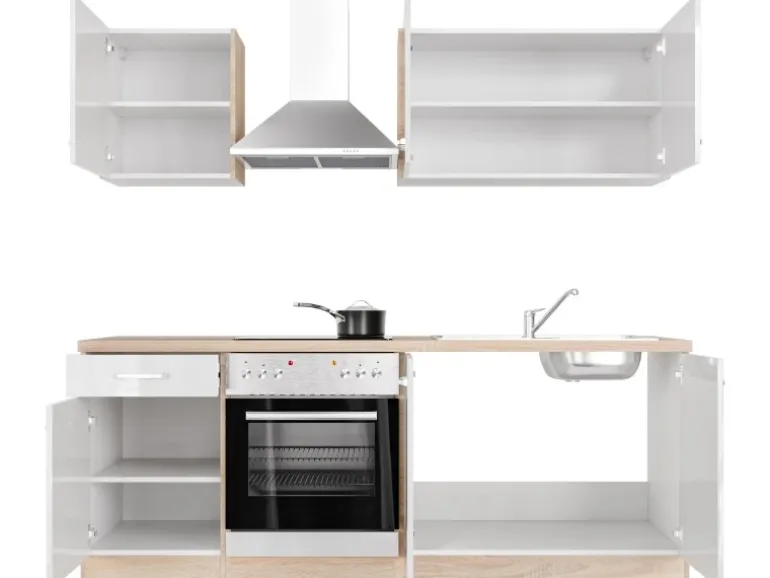 Gleich drei Hängeschränke mit jeweils einem Einlegeboden bieten reichlich Platz für Geschirr und Gläser. Im Unterschrank mit Schublade und Einlegeboden finden Besteck, Töpfe und/oder Vorräte ihren Platz. Auch im geräumigen Spülenunterschrank mit 86 cm großer Edelstahl-Einbauspüle lässt sich noch manches Küchen- und Putzutensil problemlos unterbringen. Und wenn es wirklich einmal mehr werden sollte, können Sie Ihre Küche problemlos mit weiteren Schränken aus der Serie erweitern.