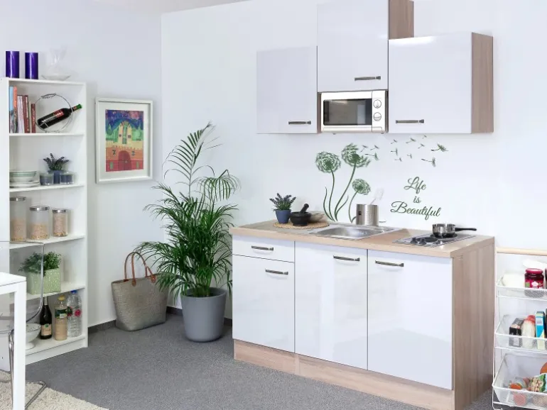 Sie haben bereits einen Kühlschrank auf den Sie nicht verzichten wollen? Dann finden Sie mit diesem vorkonfigurierten Single-Block alle weiteren Geräte, die grundsätzlich in einer Küche gebraucht werden. Leckere Mahlzeiten lassen sich schnell auf dem Zwei-Plattenkochfeld (zwei Blitzkochzonen mit bis zu 2.000 W Leistung) zubereiten. Und ein besonderes Highlight ist die integrierte 700 W Mikrowelle mit 6 Leistungsstufen und einer praktischen Auftaufunktion.