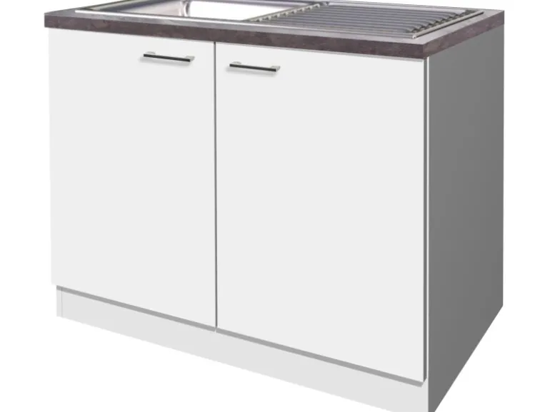 Der 100 cm breite Spülenunterschrank weiß durch eine hochwertige Verarbeitung sowie Materialauswahl zu gefallen und garantiert Ihnen auch auf kleinen Flächen ein Höchstmaß an Stauraum. Dabei verfügt der kompakte Spülenunterschrank neben zwei Drehtüren auch über eine Edelstahl-Einbauspüle mit Ab-und Überlaufgarnitur.