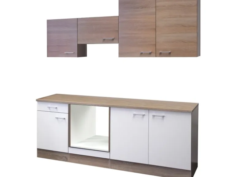 Zwei 89 cm hohe Oberschränke und ein 55 cm hoher Oberschrank mit bis zu zwei Einlegeböden bieten reichlich Platz für Geschirr und Gläser. Im Unterschrank mit einem Schubkasten, einer Drehtür und einem Einlegeboden finden Besteck, Töpfe und/oder Vorräte ihren Platz. Auch im Spülenunterschrank steht genügend Fläche zur Verfügung, um noch mancherlei Küchen- und Putzutensilien zu verstauen. Und wenn es wirklich einmal mehr werden sollte, können Sie Ihre Küche einfach mit weiteren Schränken aus der Serie erweitern.