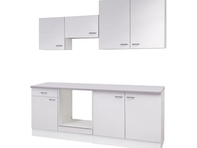 Zwei 89 cm hohe Oberschränke und ein 55 cm hoher Oberschrank mit bis zu zwei Einlegeböden bieten reichlich Platz für Geschirr und Gläser. Im Unterschrank mit einem Schubkasten, einer Drehtür und einem Einlegeboden finden Besteck, Töpfe und/oder Vorräte ihren Platz. Auch im Spülenunterschrank steht genügend Fläche zur Verfügung, um noch mancherlei Küchen- und Putzutensilien zu verstauen. Und wenn es wirklich einmal mehr werden sollte, können Sie Ihre Küche einfach mit weiteren Schränken aus der Serie erweitern.
