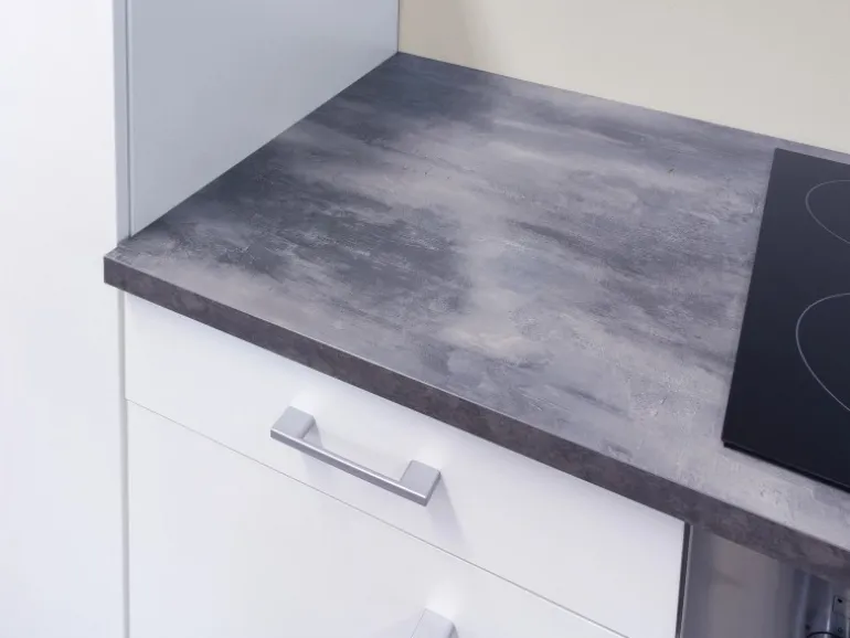 Moderne Einbauküche in Weiß mit kontrastreicher Arbeitsplatte in Steindekor-Grau