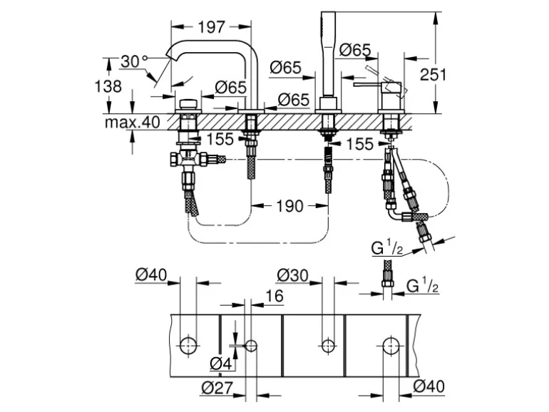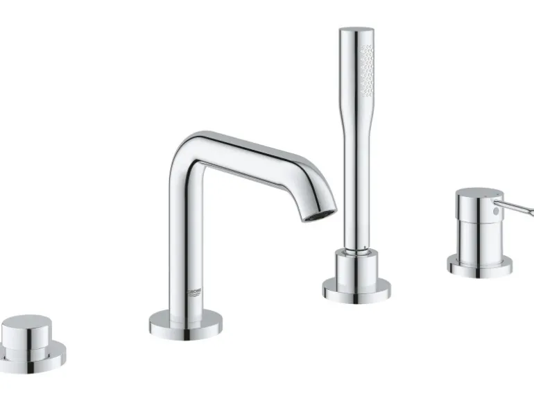 Die Grohe 4-Loch Einhand-Wannenkombination Essence besteht aus einer Auslauf-Aufnahme (vormontiert), einen Handmischer-Bedienelement, einen Wanneneinlauf mit Mousseur und einer Umstellung (Wanne/Brause). Für Chrom: ist die Euphoria Cosmopolitan Stick Handbrause 27 806, für andere Oberflächen: die Sena Stick Handbrause 26 465 geeignet. Der Metallbrauseschlauch hat eine Länge von 200 cm. Die Anschlussschläuche sind flexibel. Das Set ist eigensicher gegen Rückfließen und kann mit 29 037 verwendet werden. Es hat eine Grohe SilkMove 3,5 cm Keramikkartusche mit Temperaturbegrenzer.