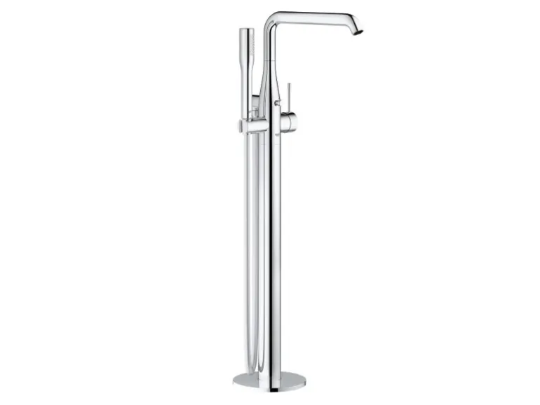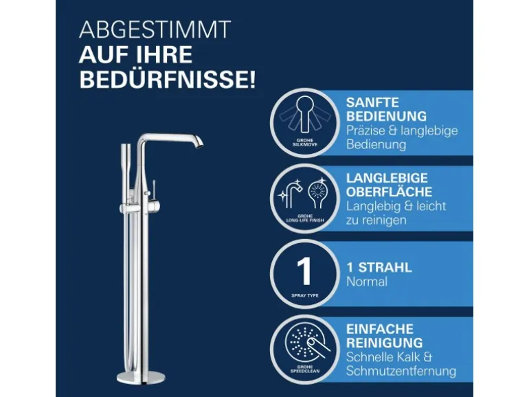 Die Grohe Einhand-Wannenbatterie Essence verbindet Eleganz mit ausgezeichneter Leistung. Diese Wannenarmatur ist der ideale Partner für Ihre freistehende Badewanne. Das zylindrische Design der Grohe Essence Serie ist mit der glänzenden Grohe StarLight Chromoberfläche versehen. Sie wird als Garnitur mit Wandbrausehalter, Grohe Euphoria Cosmopolitan Stick Handbrause (27400000) und Grohe SilverFlex 125-cm-Brauseschlauch (28362000) geliefert. Mit der in die Einhand-Armatur integrierten Grohe SilkMove Kartusche lassen sich Wassertemperatur und Volumen mühelos und präzise regeln. Der Auslauf ist bis 360 Grad schwenkbar und die SpeedClean Düsen sind äußerst pflegeleicht. Mit dem integrierten Grohe AquaGuide lässt sich der Strahlwinkel des Wannenauslaufs mühelos einstellen.
