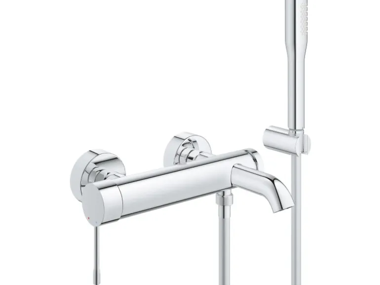 Mit der Grohe Einhand-Wannenbatterie Essence erhalten Sie gleichzeitig auch eine Brausegarnitur. Beide bieten neben ihrer ansprechenden Optik intelligente, bedienerfreundliche Technik. Mit ihrem klassischen zylindrischen Design und der glänzenden Grohe StarLight Chromoberfläche vereint diese Einhand-Armatur ansprechende Ästhetik und hohe Leistung. Die Grohe SilkMove Kartusche sorgt für eine unkomplizierte Handhabung. Die integrierte Umstellung wechselt nahtlos zwischen Wannen- und Brausezulauf. Die Wandarmatur beinhaltet den Grohe Tempesta 100 Cosmopolitan Wandbrausehalter (27594000), die Grohe Euphoria Cosmopolitan Stick Handbrause (27400000) mit einer maximalen Durchflussrate von 9,5 Litern pro Minute und den Grohe SilverFlex 150 cm TwistFree Brauseschlauch (28364).
