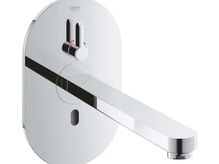 Die Grohe Infrarot-Elektronik Eurosmart CE für Ihren Waschtisch ist mit Mischeinrichtung und variabel einstellbarem Temperaturbegrenzer ausgestattet. Die intelligente Elektronik besitzt einen Infrarot-Sensor für bidirektionale Kommunikation. Sie verfügt über einen Trafo 100-230 V AC, 50-60 Hz, 6 V DC. Die Ausladung der Armatur misst 23,2 cm.