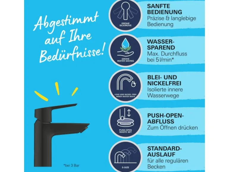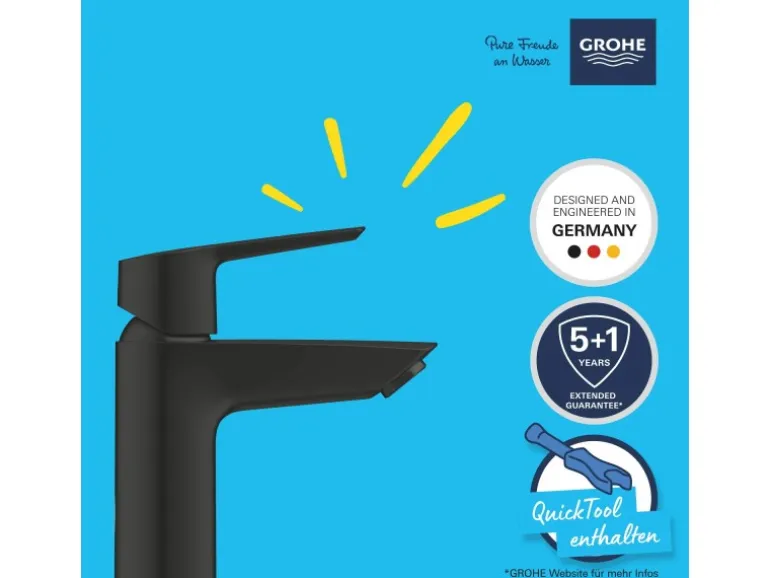 Die Armatur ist mit der langlebigen Grohe SilkMove Keramikkartusche ausgestattet, die eine präzise Regulierung der Wassermenge und -temperatur über einen robusten Metallhebel ermöglicht. Der integrierte Temperaturbegrenzer spart Energie, und die Grohe Wasserspartechnologie begrenzt den Wasserverbrauch auf 5,7 l/min, ohne dabei die Leistung zu beeinträchtigen.