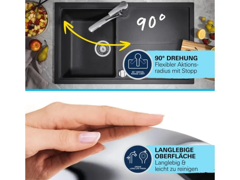– Moderner Bedienhebel, flacher & schwenkbarer Auslauf bis 90°