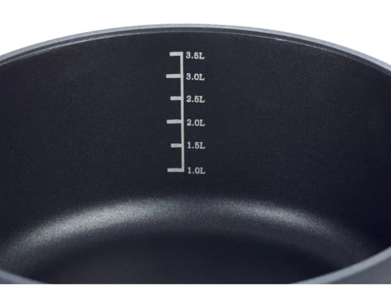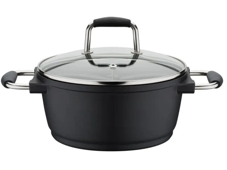 Dieser Kochtopf ist aus hochwertigem Aluminium-Guss gefertigt und verfügt über eine mehrfache, langlebige Antihaft-Versiegelung, sowie innen eine praktische Literskala. Der extra starke Thermo Boden und die Edelstahlgriffe mit wärmeabweisenden Silikon sorgen für Spaß beim Kochen. Der Topf ist für alle Herdarten – auch für Induktion geeignet. Kochtopf mit Glasdeckel 28 x H 12,7 cm, ca. 6,7 L. Spülmaschinengeeignet. Backofengeeignet bis 240C